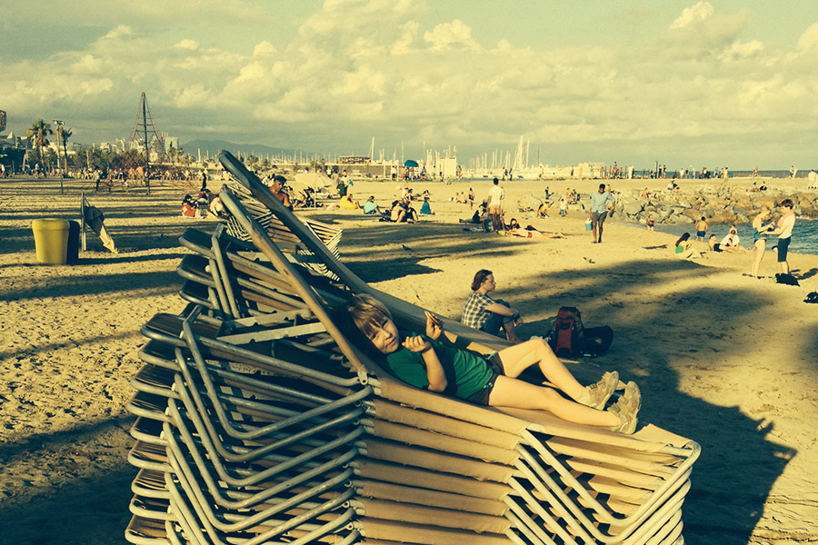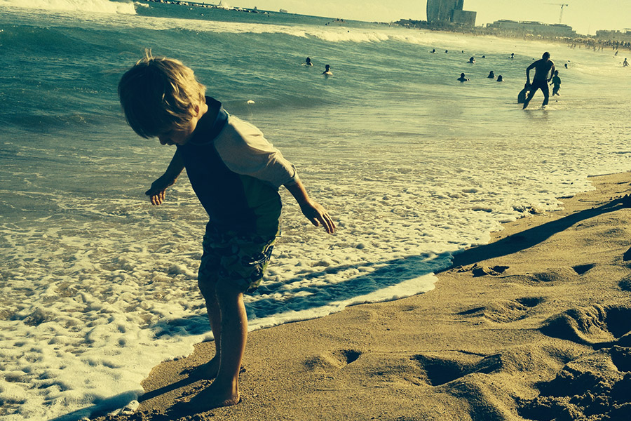Die Wanderung zum Strand in Barceloneta ist dann doch etwas weit für den vierjährigen Milan. Zum Glück sind die Kinder unserer Freunde auch dabei, sodass der Weg nicht langweilig wird. Der Strand, das Meer, die Sonne und die recht hohen Wellen entschädigen uns für alle Strapazen und wir genießen einen schönen Spätsommertag mit unseren Freunden am Strand.