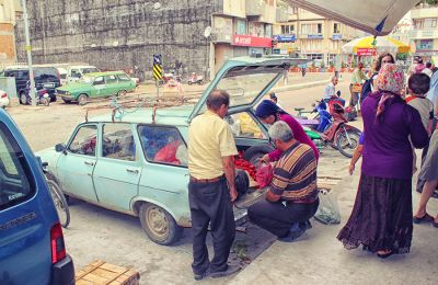 Eine Fahrt zum Markt nach Kumluca (ca. 40 Minuten Fahrt), der jeden Freitag stattfindet, wird von Hotels und Touranbietern in Cirali angeboten, wir sind diesmal selbst hingefahren. Der Markt ist kein typischer Touristenmarkt, sondern ein ganz normaler Wochenmarkt, auf dem die Einheimischen einkaufen. Hier trifft man z.B. auch die Restaurantbesitzer aus Cirali. Dieses Mal haben wir Ceylal von Hayriyes Gözlemerrestaurant getroffen und uns direkt fast wie Einheimische gefühlt haben. Der Markt ist super günstig, man wird als Tourist nicht übers Ohr gehauen und es gibt fast alles, was man braucht, z.B. ein praktisches Klappmesser, das uns noch fehlte, um den gerade erstandenen Granatapfel auch unterwegs essen zu können. Hier kann man auch gut Mitbringsel kaufen wie Honig mit Wabe, Granatapfelsirup in Plastikflaschen etc. Sehr lecker sind auch die verschiedenen Oliven, die für 10 Lira das Kilo angeboten werden, und die Erdnüsse in Sesamkruste! Vor fünf Jahren wurden auf der Rückseite des Marktes noch Ziegen und andere lebende Tiere angeboten. Die sind heute allerdings Fressbuden, v.a. Köfteständen gewichen. Es soll hier auch einen Kleidermarkt geben (ebenfalls jeden Freitag), allerdings an einer anderen Stelle, die wir noch nicht gefunden haben. Hier gibt es Stoffe und die typischen Flatterhosen sehr günstig.