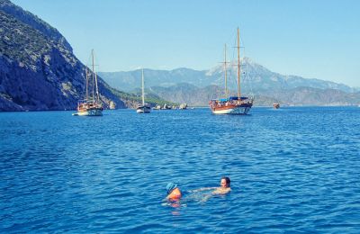 Ein anderes Mal sind wir vor einigen Jahren zusammen mit einer anderen Familie, die wir im Hotel Aida in Cirali kennen gelernt hatten, ganz früh morgens, bevor es zu heiß wird, nach Olympos gewandert. D.h. die Männer sind mit den Kindern am Strand lang gewandert, die andere Mutter und ich geschwommen, beides dauert ca. 40 Minuten. Das Schwimmen der Strecke ist herrlich mit dem Blick vom Meer auf die wunderschöne Bucht...