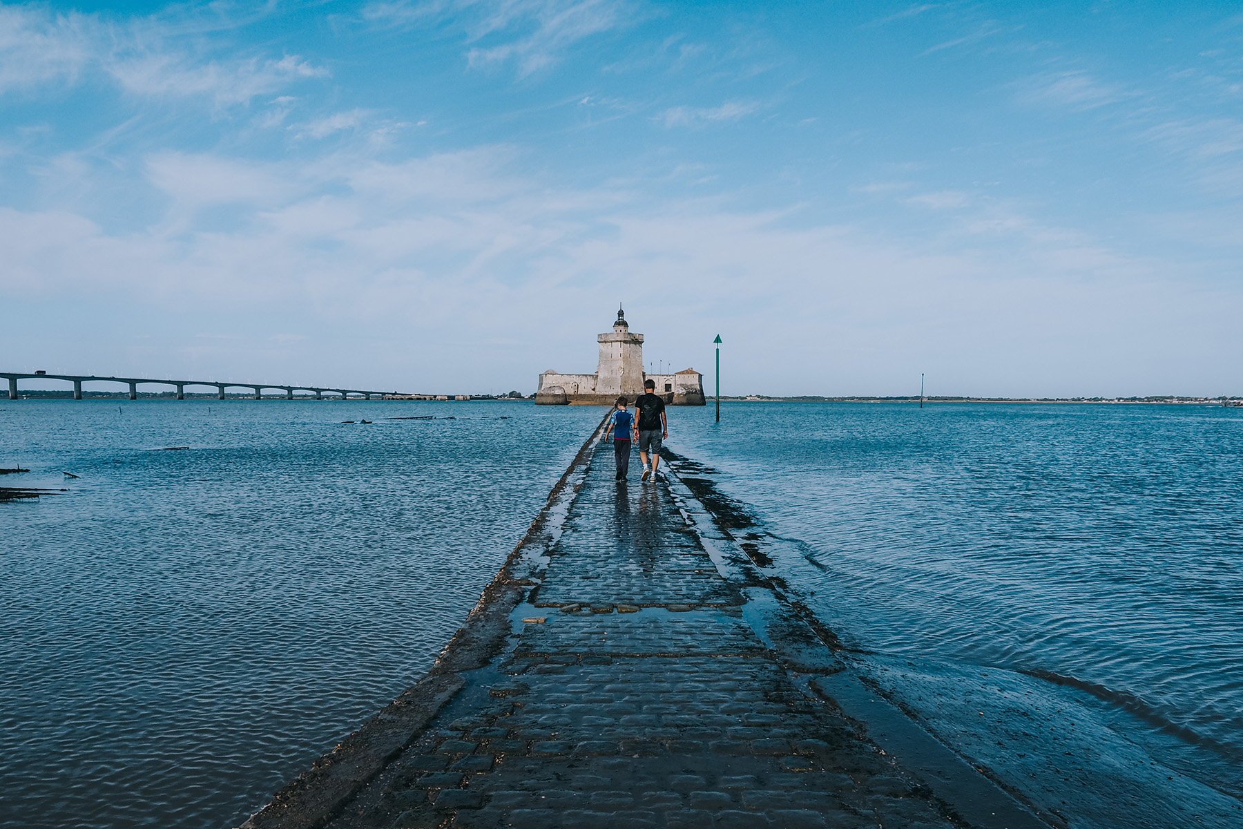 Weiter geht’s zum der Île d'Oléron vorgelagerten hufeisenförmigen Festungsinsel Fort Louvois, die ihr nur bei Ebbe erreicht, heute ab 11:30 Uhr. Um Punkt 11:30 Uhr stehen wir am Hafen und fragen uns, wie wir das Fort trockenen Fußes erreichen sollen. Doch schon nach wenigen Augenblicken erscheint ein gepflasterter Weg hinüber wie aus dem Nichts. Dort angekommen, nimmt uns Daniel, der auch gut Deutsch spricht, in Empfang und erklärt uns alles. Innerhalb von 4 Jahren wurde Fort Louvois auf einer kleinen Felsinsel erbaut, jeweils 3-4 Stunden tagsüber und in der Nacht mit Laternen. Wir besichtigen die Kaserne mit Schlafplätzen, Aufenthaltsraum und Zisterne, den aus Kalkstein (an der Charente sehr verbreitet) erbauten Turm mit Kommandantenwohnung, Waffenlager und Terrasse mit bestem Ausblick, und auch die Pulverkammer. Die Jungs freuen sich über lustige Ritterspiele, die Daniel für sie aufbaut: Seil- und Ballwerfen auf Holzgestalten.