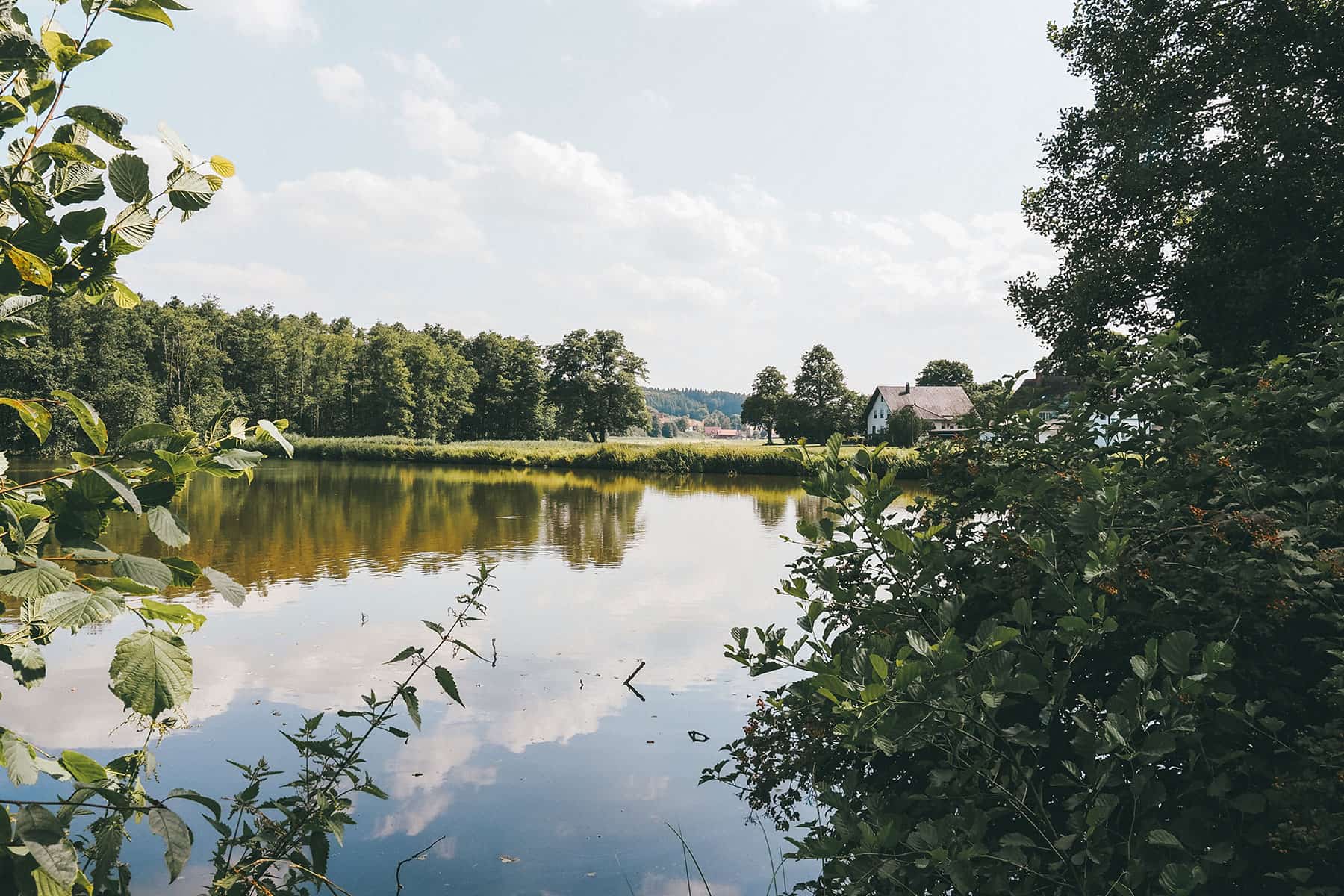 Nach der Kletterpartie im Waldseilgarten wollen wir die Landschaft Bayerisch-Schwabens erkunden und den schönen, warmen Sommertag ausnutzen. Bereits in Günzburg haben wir die Bayerisch-Schwaben Lauschtouren App ausprobiert und nutzen sie nun auch bei unserem Halt am Kloster Roggenburg, das sich in der Nähe unserer Unterkunft Vogt-Mühle befindet. Wir starten natürlich bei der Lauschstation 1, die sich beim Zentrum für Familie, Umwelt und Kultur auf dem Klostergelände befindet. Wir lauschen und folgen der freundlichen Stimme, die uns zu einer Besichtigung der wunderschönen barocken Klosterkirche animiert. Wir erfahren so nicht nur Interessantes über die Geschichte des Klosters und der Kirche, sondern zum Beispiel auch über den hiesigen Obstanbau und die unmittelbaren Nachbarn, die häufig in dieser Region vorkommenden Biber. Und so ändern wir spontan unsere Tour und kombinieren die Lauschtour mit der Wanderroute Bibertour. Denn die führt am nahegelegenen Langweiher vorbei, der sich bei den Temperaturen ideal für eine kleine Abkühlung eignet. Auf einem Steg machen wir es uns gemütlich, springen ins Wasser und schwimmen eine Runde im herrlichen See. Erfrischt geht es anschließend weiter entlang des Sees durch den Wald und über Felder zurück zum Kloster. Einzig die Mücken und Bremsen haben ziemlich genervt. Hier empfehlen wir auf jeden Fall einen guten Mückenschutz, denn hier ist man wirklich inmitten der Natur.