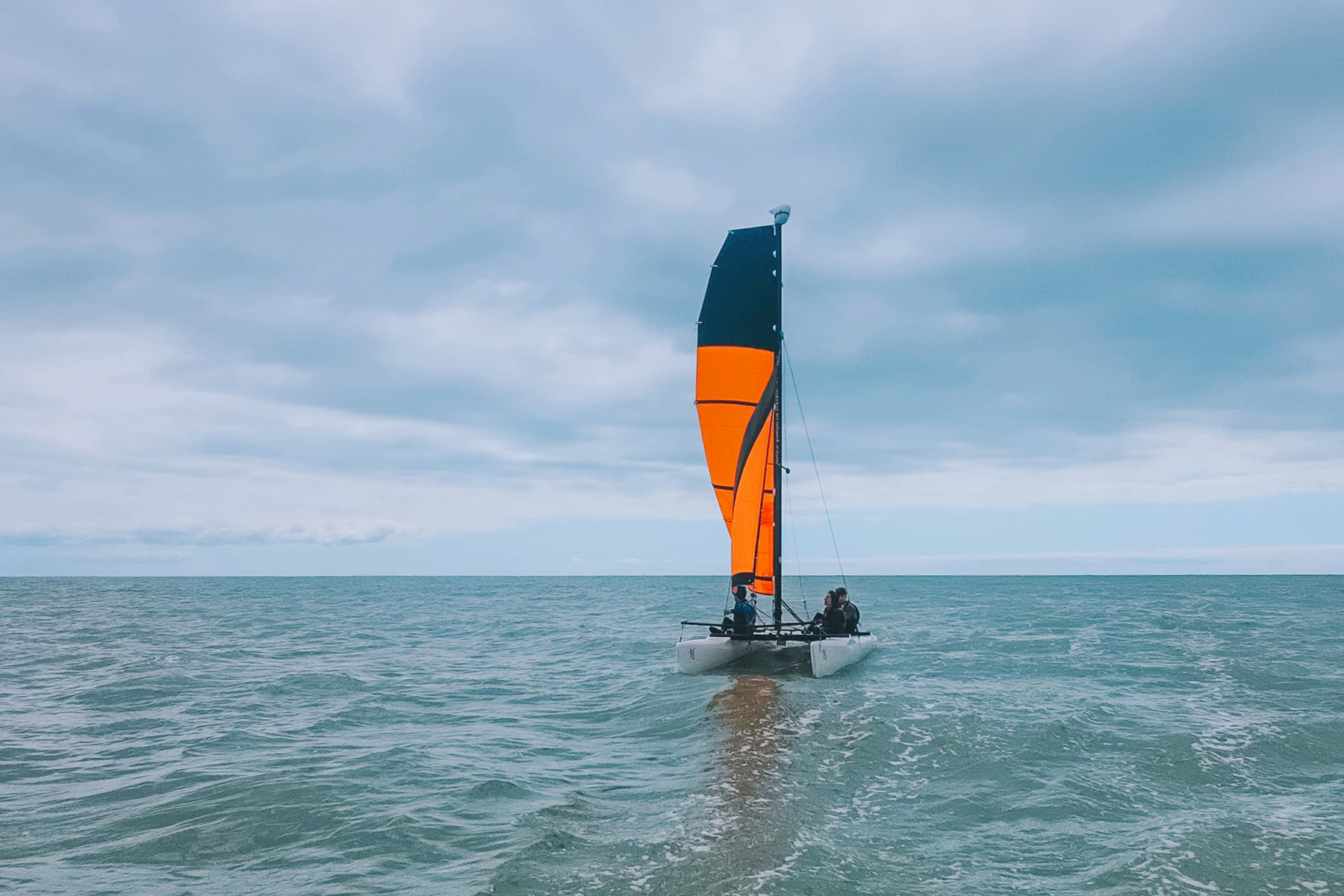 Das Mittagessen könnt ihr perfekt mit der gleich nebenan liegenden Segelschule Ocean Players verbinden. Hier könnt ihr Windsurfen oder Katamaran fahren. Für uns ist das Katamaransegeln absolutes Neuland. In Neoprenanzügen gehen wir in den bewähren Kanuteams von heute Morgen zu jeweils zweit an Bord zweier Katamarane. Natürlich nicht ohne Begleitung, sonst wären wir heillos überfordert. Segellehrer Willi und Antoine geben uns genaue Anweisungen, auf welcher Seite wir jeweils sitzen, welche Seile welcher Segel wir wie setzen und wie wir die Boote steuern. Das klappt mit Hilfe sogar erstaunlich gut. Der Wind bläst ordentlich und wir nehmen ganz schön Fahrt auf. Es macht richtig Spaß. Nach einer Stunde auf See sind wir allerdings ziemlich durchgefroren und spüren unsere Gliedmaßen gar nicht mehr. Zum Glück gibt es heiße Duschen bei Ocean Players, die wir nach unserer Rückkehr an Land dankbar nutzen.