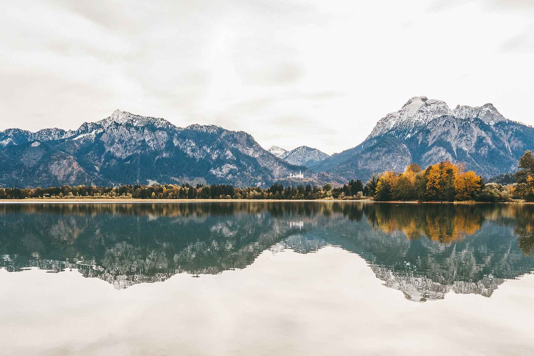Heute reisen wir weiter nach Füssen. Wir finden einen Stellplatz etwas außerhalb der Stadt, von dem aus wir in wenigen Minuten mit dem Rad zum Forggensee fahren. Unser Ziel ist, den See einmal zu umrunden, das sind 32 Kilometer. Womit wir nicht gerechnet hatten, ist, dass der Radweg nur selten direkt am Seeufer entlangführt und oft recht steil auf und ab, was den Jungs (und manchmal auch uns) manchmal schwerfällt. Anfangs wundern wir uns noch, dass wir ständig von rüstigen Rentnergruppen überholt werden. Bis wir merken, dass sie alle E-Bike fahren. Dafür werden wir mit traumhaft schönen Blicken auf grüne Wiesen, herbstlich bunte Bäume, den still daliegenden See und die schneebedeckten Alpen im Hintergrund belohnt. Auch auf das herrlich kitschige Schloss Neuschwanstein und das gleich nebenan liegende Schloss Hohenschwangau blicken wir oft. Nach ungefähr halber Strecke finden wir einen idyllischen Rastplatz auf einem Bootsanleger, im Sommer in Strandbad. Hier rasten wir mit wunderschönem Schwangaublick und fahren dann weiter, durch kleine Ortschaften, vorbei an Kuhweiden, Marienbildern, Staumauer und Ausläufern des Sees.