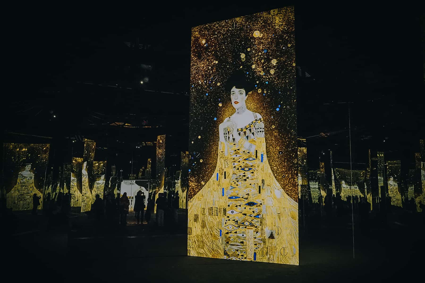 Wir parken auf dem kostenlosen Parkplatz direkt gegenüber der gut ausgeschilderten Halle. Nachdem wir unsere Karten erhalten und unsere Jacken in Schließfächern untergebracht haben (die Halle ist auch jetzt im Winter warm genug ohne), betreten wir gespannt die dunkle Industriehalle. Wir wissen zwar in etwa, was uns erwartet und freuen uns auf Klimt, Hundertwasser und zeitgenössische Kunst. Und doch tauchen wir plötzlich in einen ganz eigenen Kosmos ein. Richtig feierlich ist uns zumute.