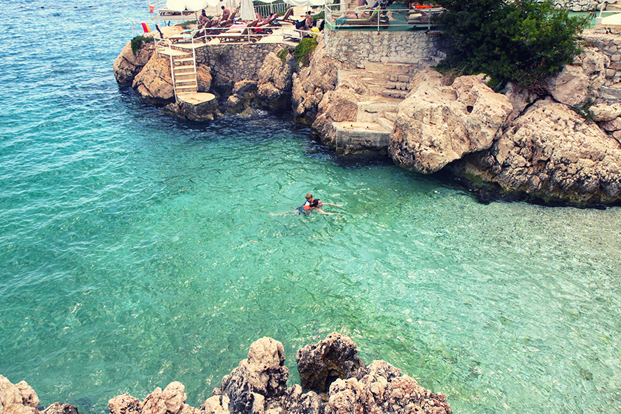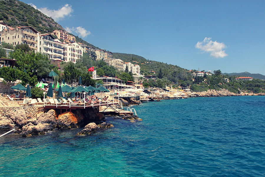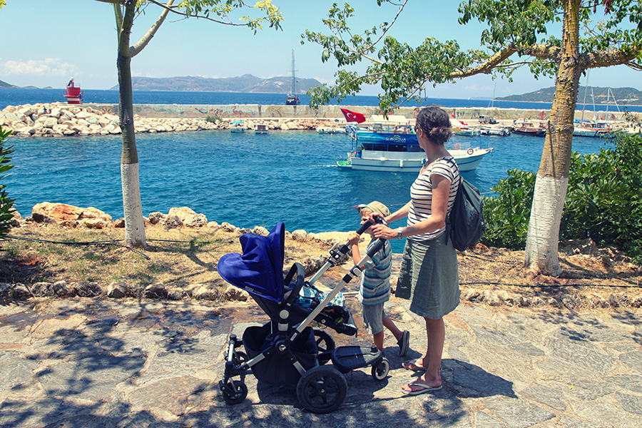 Kaş ist ein schmuckes, griechisch geprägtes Städtchen mit schönen, belebten Plätzen, einem schicken Hafen und vielen terrassenförmig angelegten Strandbars, von denen aus man in kleine Kiesbuchten hinabsteigen und im klaren Meer baden kann. Wir haben uns erst gar nicht in diese unzähligen Strandbars hinein getraut, weil sie so mondän wirken, was völliger Quatsch war, wie sich hinterher herausstellt. Zum Glück hat uns jemand angesprochen und uns unsere Bedenken, wir könnten irgendwelche sonnenbadenden, ruhesuchenden Reichen und Schönen mit Kindergeschrei belästigen, zerstreut. Fast hätten wir vergessen, dass wir immer noch in der Türkei sind – kein Grund zur Sorge also. Im Gegenteil: nach einiger Zeit (man kann hier ewig rumhängen, muss noch nicht einmal Eintritt zahlen, einen Mindestverzehr gibt es nicht und die Preise sind für eine solche Top Location wirklich human!) gesellt sich ein sehr junger Kellner zu uns (nicht ohne vorher höflich zu fragen) und fragt, ob er mit Mato spielen dürfe- Wir sind richtig gerührt. Hier verbringen wir einen herrlich relaxten Tag mit leckerem Essen, kalten Getränken, Eis und Baden im Meer, bevor wir uns zu einem Abendspaziergang durch das Örtchen inklusive einem längeren Spielplatzbesuch aufmachen.