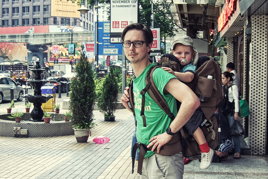 Zum Glück haben wir uns am Morgen dazu entschieden, Milan nicht in seinen Buggy zu setzen, sondern ihn in der ebenfalls mitgebrachten Kraxe zu transportieren. Kuala Lumpur scheint nicht unbedingt für Fußgänger gemacht zu sein, noch weniger für Kinderwagen. Mehrspurige Straßen lassen ein Überqueren zum Abenteuer werden und Verkehrsinseln gewinnen als rettende Oasen eine gewisse Attraktivität. Die Fußgängerwege führen, falls überhaupt vorhanden, gerne ins Nichts und Fußgängerbrücken mit ihren steilen Treppen sind auch erstmal bei 30 Grad zu erklimmen.