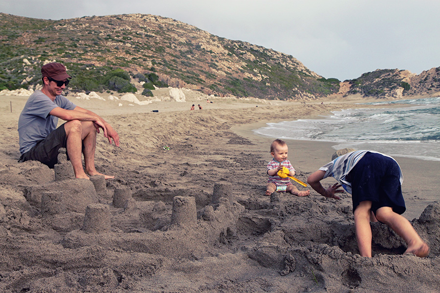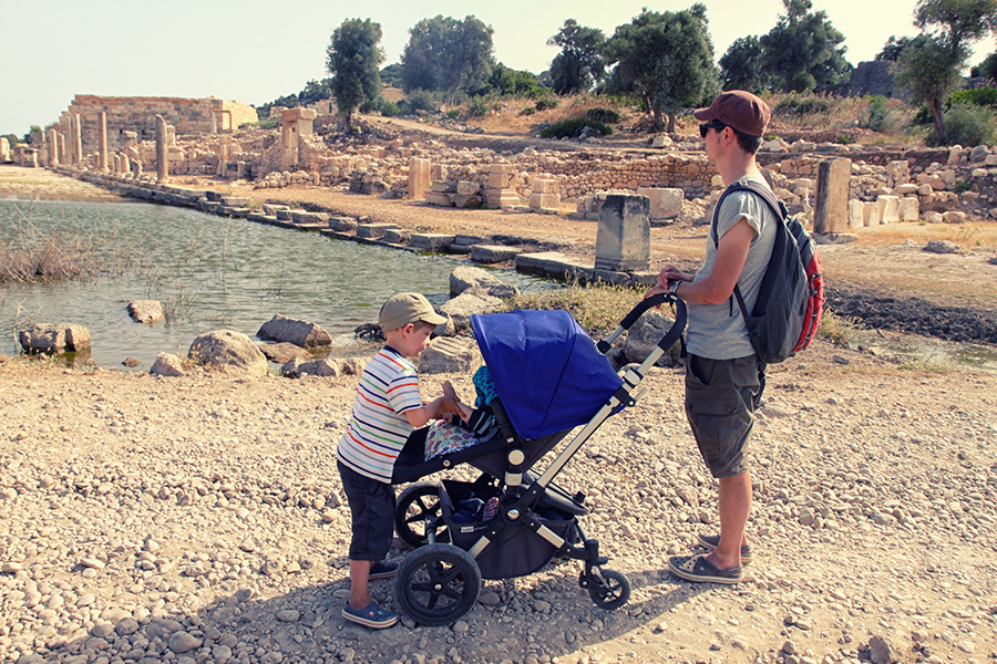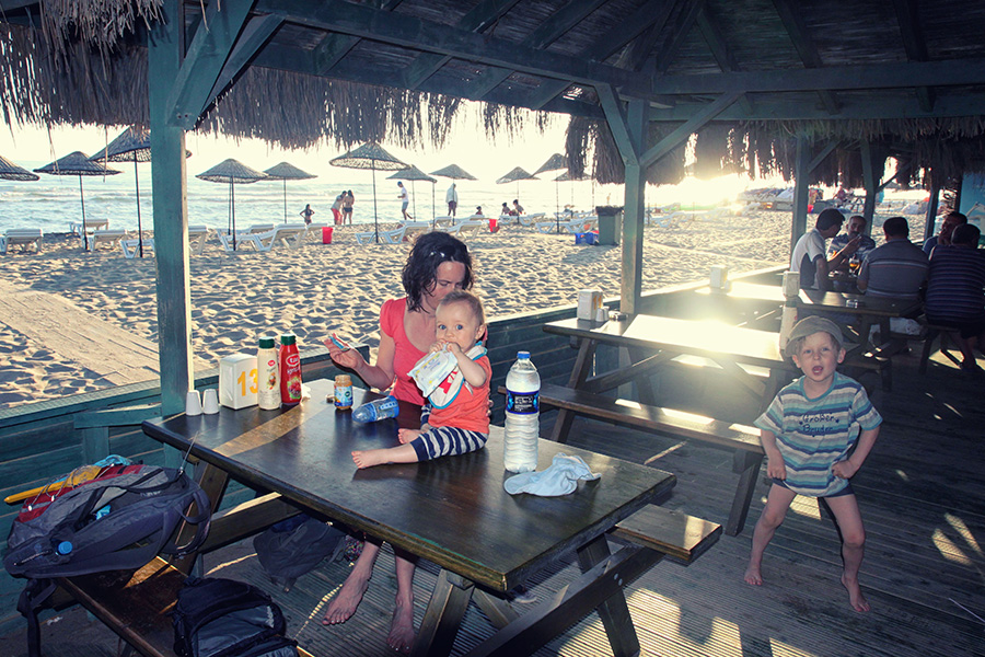 Der Strand selbst ist fast 20 km lang und erinnert an Holland, Frankreich oder Dänemark (nur dass das Wetter hier besser ist). Feiner, endloser Sand, der zum Einbuddeln und Burgenbauen einlädt. Unsere mitgebrachte Strandmuschel hat sich hier wirklich rentiert, da Schatten rar ist und der Wind zum Teil extrem. Ohne Strandmuschel hätten wir zumindest Mato nicht zum Mittagsschlaf am Strand bewegen können. Eine Strandbar (auch die sieht aus wie in Holland und bietet ähnliche Fertiggerichte an) ist eine andere Pausenoption. Meistens haben wir uns allerdings im kleinen Ort Patara (Gelemis?) leckere belegte Sandwiches mitbenommen (im sehr netten Supermarkt mit anschließendem Restaurant). Als wir eigentlich schon weitergereist sind in das nicht allzu weit entfernte Kas kommen wir übrigens noch einmal wieder zum Patarastrand. Obwohl wir eine ganze Woche in Patara verbracht haben, zieht es uns noch mal zurück. Milan hat einen Freund gefunden, mit dem er sehr glückliche Strandtage verbringt und ich kann mir gerade auch nichts Entspannteres vorstellen, als meinen Geburtstag in Patara am kilometerlangen Strand zu verbringen, bis die Sonne untergeht.