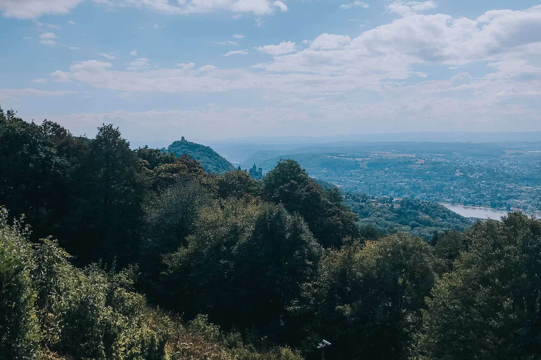 Vor dem historischen Rathaus auf dem Marktplatz finden wir den Startpunkt des Rheinsteigs, der uns zunächst ans Rheinufer und die Uferpromenade entlang in Richtung Süden führt, das Siebengebirge, das wir heute erwandern werden, schon im Blick. Heute haben wir weniger Glück mit dem Wetter. Es hat sich deutlich abgekühlt und gießt mittlerweile in Strömen. Ich friere, obwohl ich all meine mitgebrachten Klamotten übereinander trage. Wir erreichen die Rheinauen und wechseln die Rheinseite über eine Autobahnbrücke. Auf der anderen Seite wandern wir weiter, immer in Richtung Süden. Irgendwann fragen wir uns, wann wir denn mal vom Rhein abbiegen und uns dem Siebengebirge nähern werden. Eine Beschilderung haben wir auch schon länger nicht mehr gesehen. Eigentlich ist der Rheinsteig blau gekennzeichnet. Unsere Strecke bisher war allerdings gelb, was uns schon etwas stutzig gemacht hat. Wir recherchieren, dass wir schon von Anfang an falsch gelaufen sind. Gleich in der Bonner Altstadt hätten wir die Brücke auf die andere Rheinseite nehmen müssen. Die gelbe Beschilderung ist ein Rheinsteig-Zuweg. Nun geht es mit Google Maps weiter querfeldein. In Niederdollendorf finden wir die gelbe Beschilderung wieder. Hier machen wir auch erstmal Rast in einer Bäckerei. Ganz schön was los hier, Feuerwehrfest mit viel Tatütata, türkische Großhochzeit mit lautem Trommeln, und wir mittendrin auf der Hauptstraße. Weiter wandern wir nach Oberdollendorf und nun geht es ganz schön bergan. Die Strecke kenne ich als Autostrecke ins Siebengebirge. Beschauliche Landschaft, der erste Weinberg, schnuckelige Fachwerkhäuser, ein Bachlauf mit Mühle. In der Nähe der Klosterruine Heisterbach finden wir endlich den echten Rheinsteig, dessen erste Etappe wir nun schon zur Hälfte verpasst haben. Nun ja, die Strecke den Rhein entlang war auch schön. Am frühen Nachmittag erreichen wir den Biergarten auf dem Petersberg, ein perfekter Rastplatz mit gigantischem Rheinblick. Zeit für ein alkoholfreies Hefeweizen!
