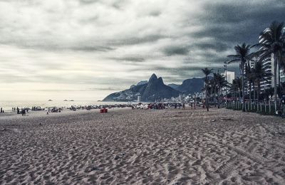 Anschliessend schlendern wir zum Strand von Ipanema. Viele Cariocas zieht es mit den Familien sonntags hier hin, sie reisen mit kompletter Montur inkl. Sonnenschirm, Campingstühle und Kühlbox an. Die Promenadenstraße ist am Wochenende gesperrt und wird von Radfahrern und Inlinern genutzt. Die Stimmung ist entspannt, auch wenn sich später der Himmel zusammenzieht und es ziemlich düster wird.