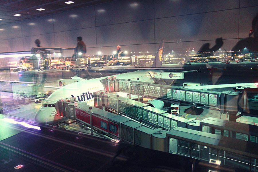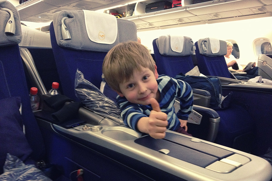 Es geht los! Von Frankfurt fliegen wir mit einem A380 der Lufthansa nach Singapur. Dieses Flugzeug ist schon recht imposant, wie es so zweistöckig am Gate steht. Innen drin wirkt alles großzügig, geräumig und modern. Insgesamt ist der Flug sehr angenehm. Da es sich um einen Nachtflug handelt, der in Frankfurt um 23:00 startet, können sich die Jungs am Gate nochmal richtig schön auspowern, um dann im Flieger friedlich einzuschlafen. Mittlerweile sind sie das Fliegen schon sehr gewöhnt, sodass auch sie eine gewisse Routine entwickelt haben und relativ gelassen an die Sache herangehen.