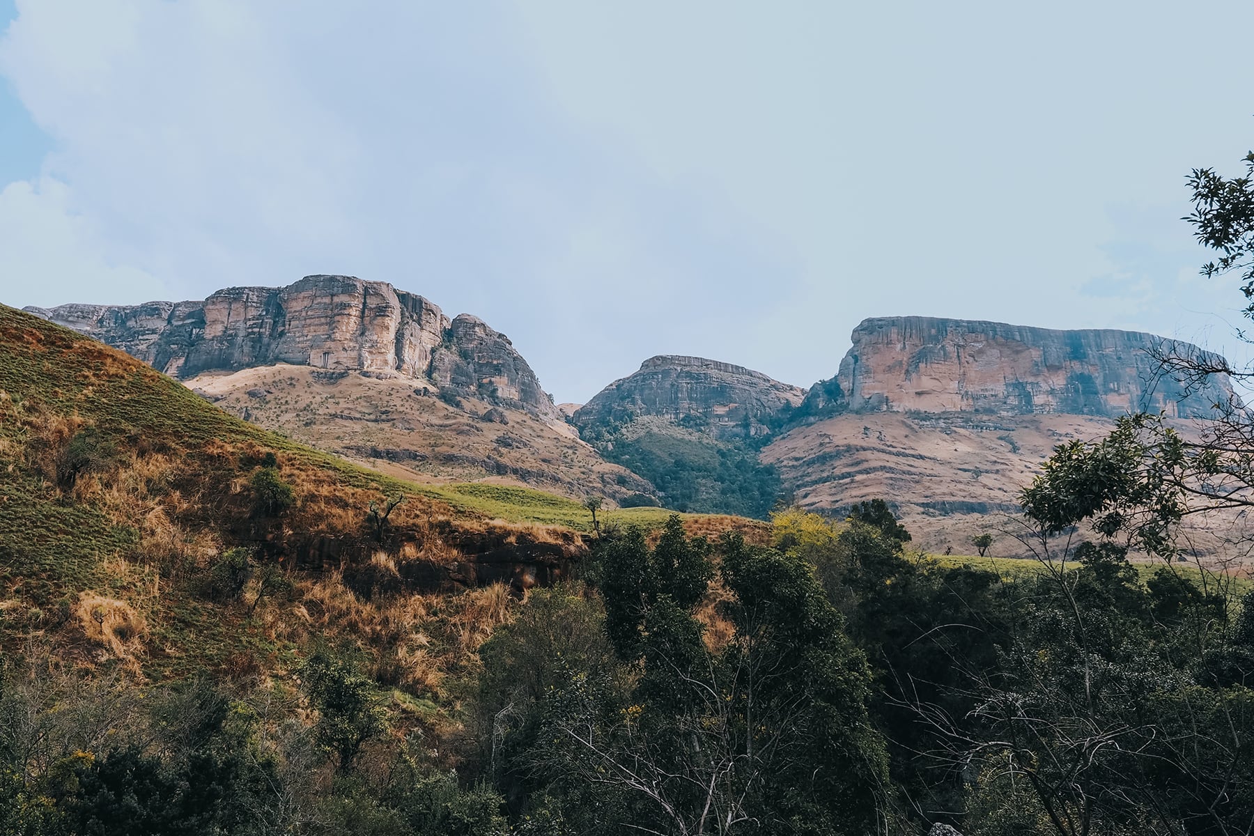 Die Drakensberge sind das höchste Gebirge im südlichen Afrika und fast 3500 Meter hoch, nahe Lesotho, wo man im Winter Skifahren kann. Man sieht die Drakensberge schon von Weitem, auf dem höchsten Gipfel liegt sogar noch Schnee.