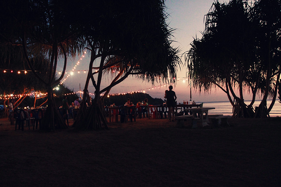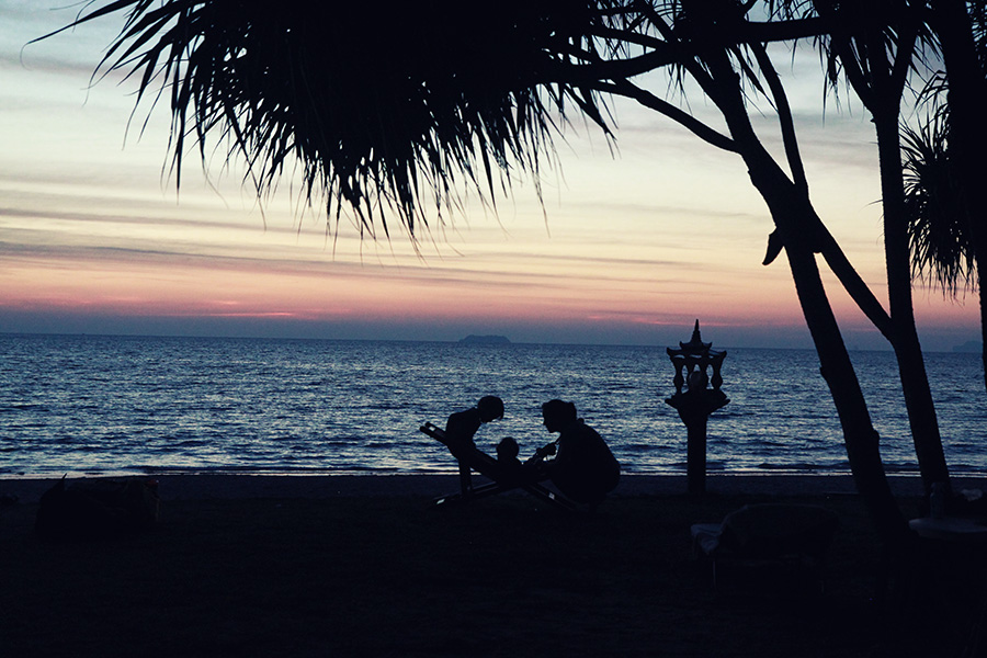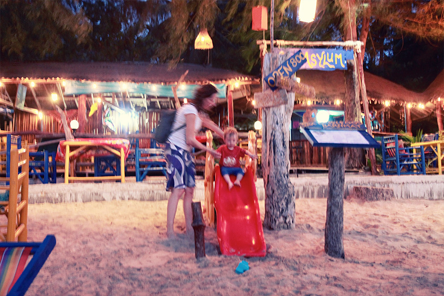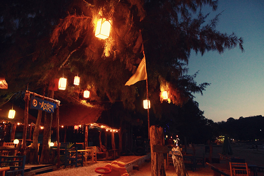 Am Strand kann man gut spazieren gehen oder auch mal joggen (die Bucht ist ca. 3 km breit). Es gibt viele gemütliche, unkomplizierte Strandbars, in denen man auch mit Kindern entspannt futtern und fläzen kann. Am besten hat uns das Asylum am südlichen Ende der Bucht gefallen, zu dem wir manchmal abend hin gelaufen sind. Dort sitzt man romantisch unter Lampions im Sand. Während man auf das nicht ganz günstige, aber dafür sehr leckere Essen wartet (es gibt auch westliche Kindergerichte. Ich kann den Som tam Salat wärmstens empfehlen!).