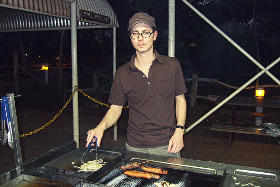 Maximal beeindruckt von der Landschaft fahren wir dem Sonnenuntergang entgegen zurück in das Outback Pioneer Hotel. Mittelpunkt der Anlage ist ein überdachter Platz mit Bänken und Tischen. Hier kann man in der Pioneer Kitchen verschiedene Gerichte bestellen. Es gibt auch einige relativ teure Restaurants im Zentrum des Ayers Rock Resort, wir entscheiden uns aber für das authentischste Abendessen: das Do-it-yourself Outback BBQ. In der Pioneer Kitchen kaufen wir ein Grill-Package (Emu-, Strauss-, Krokodil-, Rindfleisch und Maiskolben), das wir an Gasgrills grillen. Dazu gibt es Gemüse, Salat und Fritten. Jetzt noch ein kühles Bier und die abendliche Idylle im gemütlichen Outback-Lager (auch die anderen Gäste sind entspannt und sympathisch) ist perfekt.