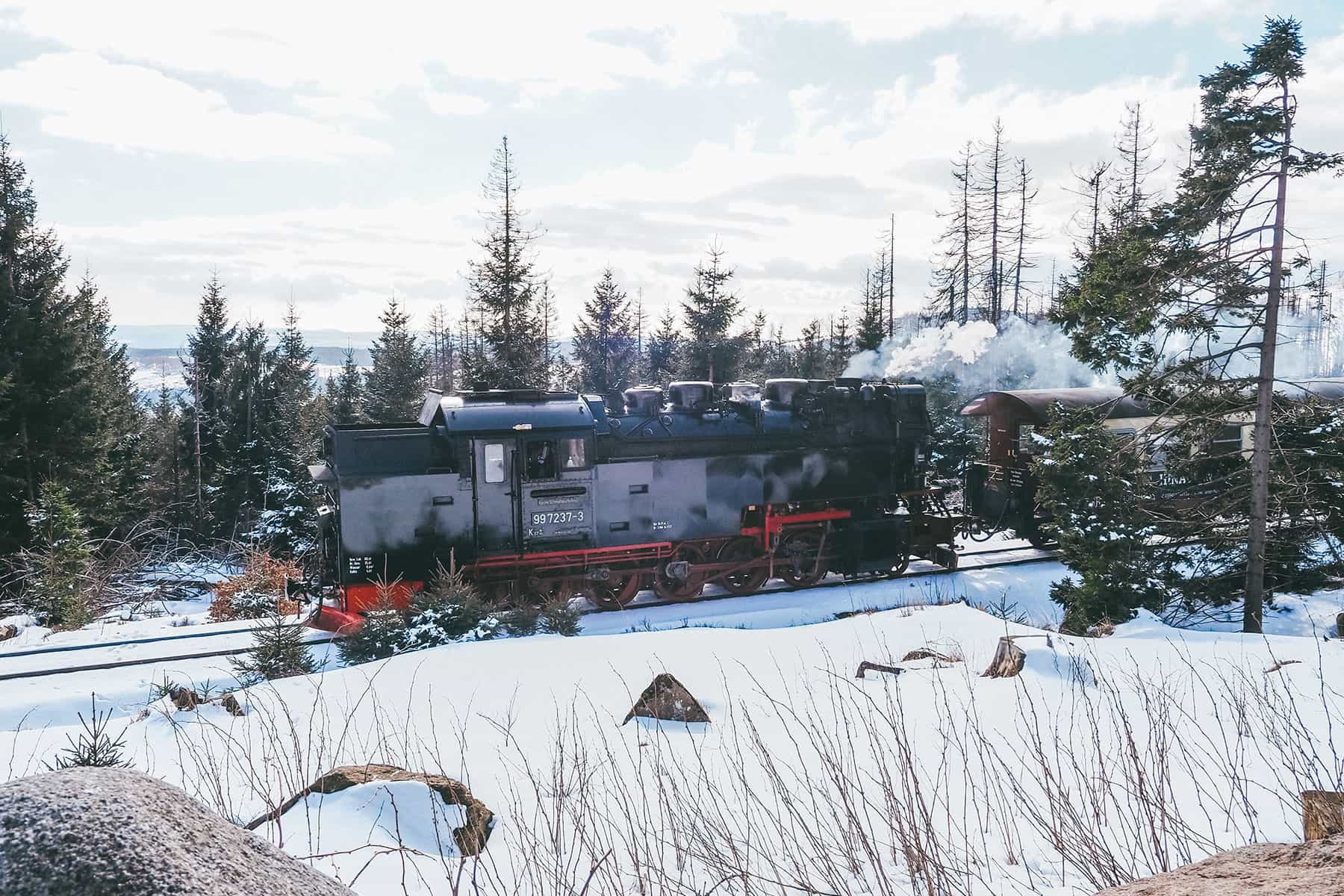 Wir haben Schlitten und Bob dabei. Die Rodelpisten auf dem nahen Wurmberg sind allerdings alle geschlossen. Zum Skifahren hätten wir uns schon um Punkt 8 oben auf dem Wurmberg Ausrüstung leihen müssen, der Andrang an einem sonnigen Karnevalssonntag ist einfach zu groß. Nach Beratung mit unseren Freunden beschließen wir, zu Fuß von der Jugendherberge aus zu starten. Wir erkunden die nahe Großmutterrodelstrecke. Allerdings liegt sie zu tief, kein Schnee weit und breit. Zum Glück haben wir Schlitten und Bob, die wir hier definitiv nicht brauchen, erstmal im Auto gelassen. Der Wald ist hier leider ziemlich in Mitleidenschaft gezogen, Klimawandel und Borkenkäfter lassen grüßen. Wir wandern den Berg hinauf in Richtung Brocken. Für wanderfaule Kinder ist die gesamte Strecke (hin und zurück jeweils 7 Kilometer auf eine Höhe von über 1100 Meter) zu weit. So begnügen wir uns mit einem Teilstück der Strecke und gehen bis zur alten Bobbahn, damals die schnellste Rennstrecke in Deutschland. Von hier oben hat man einen schönen Blick und kann die herrliche Sonne genießen. Der Weg führt durch engen Nadelwald und liegt so hoch, dass hier Schnee liegt. Außerdem dampft eine Hauptattraktion der Gegend, die Schmalspurbahn Harzer Brockenbahn hier direkt an uns vorbei. Unsere Jungs verpassen das leider, da sie lieber etwas weiter unten einen „Shelter“ bauen wollten - wohl zu viel „7 vs. Wild“ geguckt!